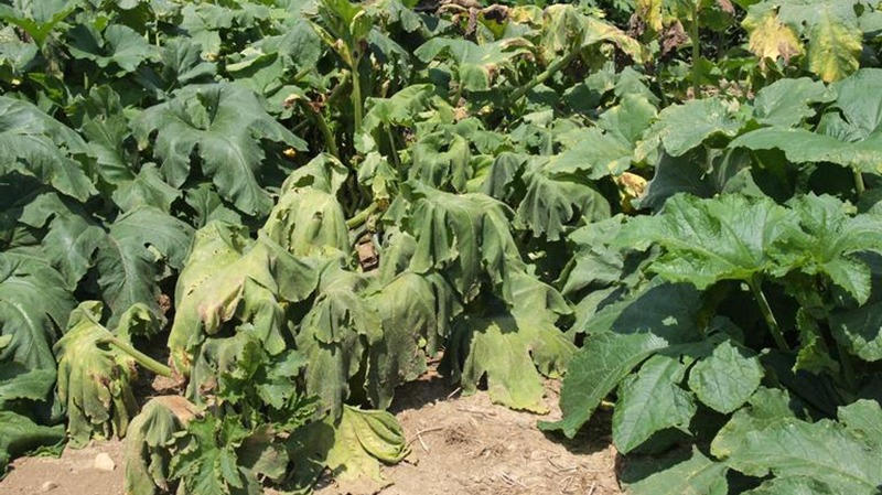 The disease is caused by Erwinia bacteria. Leaves first become pale green and wilt, usually starting from the lower leaves and gradually spreading upward. Occasionally, the entire plant may suddenly wilt. During the daytime, the wilted plant may recover slightly at night, but eventually, wilting becomes permanent. When a wilted stem is cut open, a sticky bacterial ooze can be observed. The pathogen spreads through wounds caused by beetles.