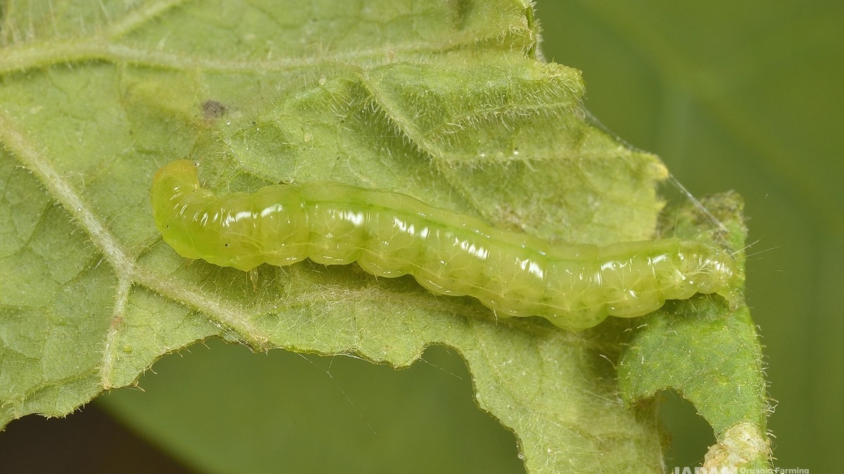 The larvae are green in color, with two distinct white longitudinal stripes running along the mid-dorsal line. They feed by scraping the green tissue of the leaves, causing damage. They chew and cut young leaves and tender shoots, and also feed on flower buds and inflorescences. Furthermore, they bore into and feed inside developing fruits, leading to serious damage.