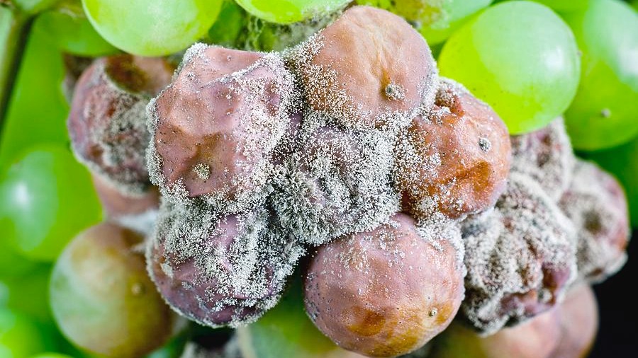 This is one of the most common post-harvest diseases of grapes. Prior to flowering, small reddish-brown necrotic spots may appear on the leaves. When the pathogen attacks the inflorescences, they wither and dry up. Infection of the fruit clusters causes rapid decay of the berries, often accompanied by the development of grayish fungal mycelia. In general, the disease remains latent in the berries until the sugar content begins to accumulate. Once symptoms appear, infected fruits crack and exude sugary juice, which facilitates rapid spread of the disease to adjacent berries. To prevent serious losses, protective fungicide sprays should be applied starting from the fruit-set stage.