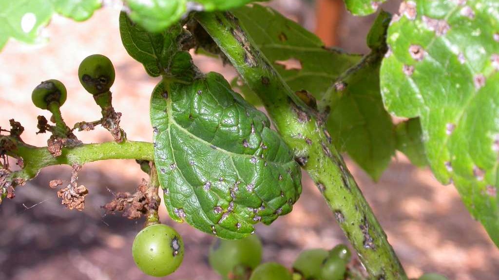 The earliest symptoms of this disease appear as reddish-brown spots on young grape leaves as well as on tender shoots. These spots gradually enlarge and may coalesce, causing the leaves to lose their natural green color and turn pale yellow. Young leaves then begin to curl downward. The infection spreads very rapidly, and within 3–4 days an entire leaf may become necrotic and dry out. When the disease attacks shoots and rachis, the affected tissues become sunken, leading to distorted shoot growth. The shoots cease elongation and remain stunted. The lesions are irregular in shape, and their margins gradually change from purplish to dark brown before finally becoming necrotic. On grapes, the disease produces sunken, grayish lesions. As these spots mature, their margins turn black, often resembling a bird’s eye. If fungicides are applied at an early stage, lesion expansion is arrested, and the affected tissue stops spreading, leaving behind small, shot-hole–like spots with dried, shredded margins. The causal fungus is also capable of surviving on parts of mango trees, which act as alternate hosts. Therefore, planting mango trees in or around vineyards is not recommended.