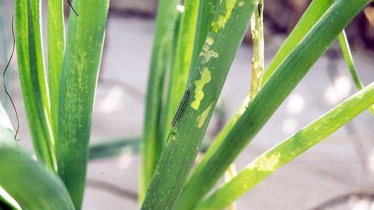 Armyworm/ Beet armyworm infestations are more likely during late spring to summer in warm conditions. Young larvae feed on the surface of onion leaves, causing windowpane-like patches or irregular holes. As larvae mature, they shew larger holes or ragged edges on the leaves. In heavy infestations, larvae may skeletonize leaves, leaving only veins. Presence of greenish-black frass on or around damaged leaves. Damaged tissues may dry out, leading to leaf curling, blighting, or even dieback. In severe infestations or late in the crop cycle, larvae may move into the bulb area and feed on the neck or outer blub scales, creating entry wounds that increase risk of secondary infections.
