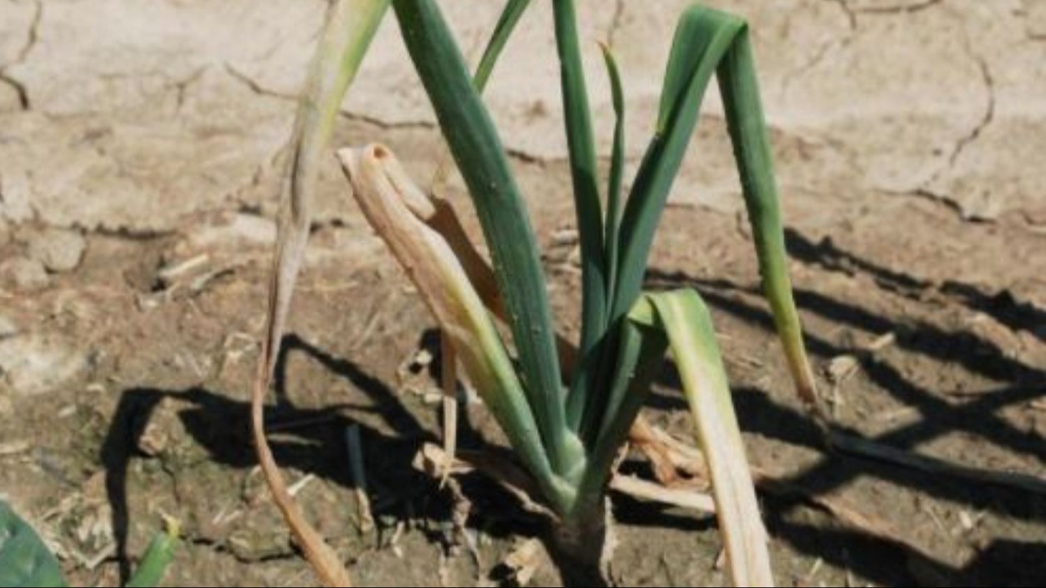 Basal rot disease is caused by Fusarium. Symptoms often begin with yellowing and drying of the leaf tips, with coloration ranging from pinkish to dark brown. In some cases, white fungal mycelium may be observed at the base of the bulb. When the bulb is cut vertically, brown discoloration can be seen in the basal area. The disease is more severe under conditions of excessive soil moisture.