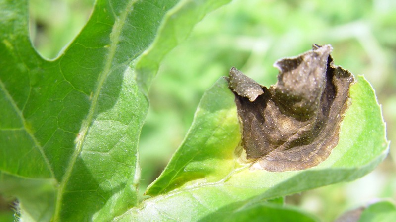 On the leaf margins and surfaces, grayish or rust-colored lesions initially develop, with small dark fungal spores visible within the lesions. When the stem is infected, dark brown lesions appear, often encircling the stem and causing wilting and eventual collapse of the plant. The gray lesions on the stem later turn whitish. Affected stem tissues frequently break apart, and rust-colored exudates may be observed oozing from the lesions. This disease is commonly observed during hot and humid conditions or under fields with high soil moisture.