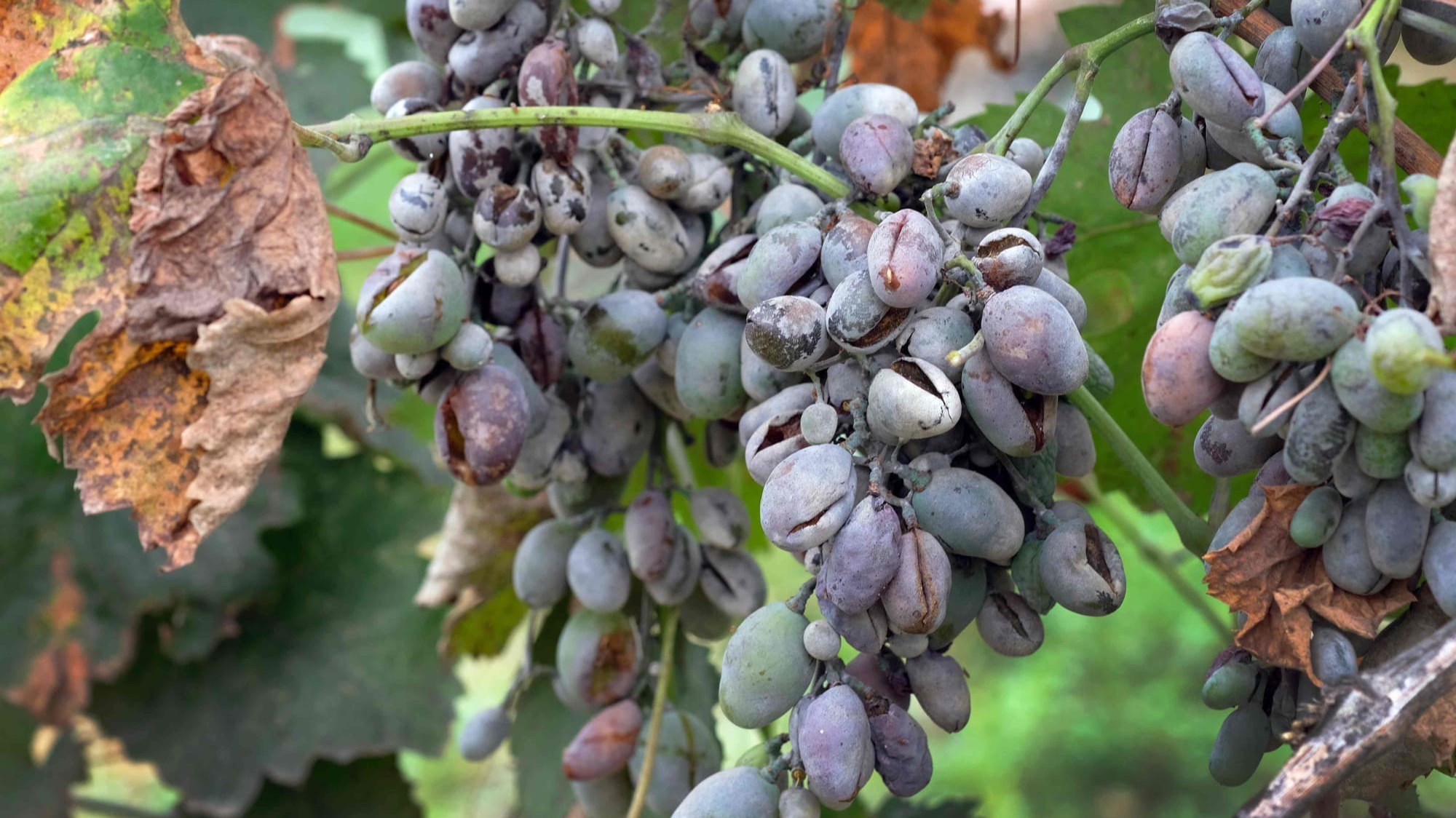 The disease initially appears as whitish powdery patches on the green parts of the grapevine. As the infection progresses, the white fungal growth becomes denser, giving the surface a dull, powder-dusted appearance. Leaves affected by the pathogen gradually change from green to reddish-brown or black. These symptoms are more prominent on the fruit clusters and peduncles. Severely infected leaves often become deformed, lose their natural color, and show reduced vigor. When the disease attacks the flower clusters, fruit set is significantly reduced. Infection at the young fruit stage causes berries to drop prematurely. On maturing fruits, symptoms include uneven growth, deformation, surface cracking, or deep scarring. Fully ripened berries are rarely affected. If the disease invades the rachis of grape clusters, it causes restricted growth, brittleness, and poor fruit quality. Under severe infestation, the fungal colonies develop into patches that appear grayish-white to black.