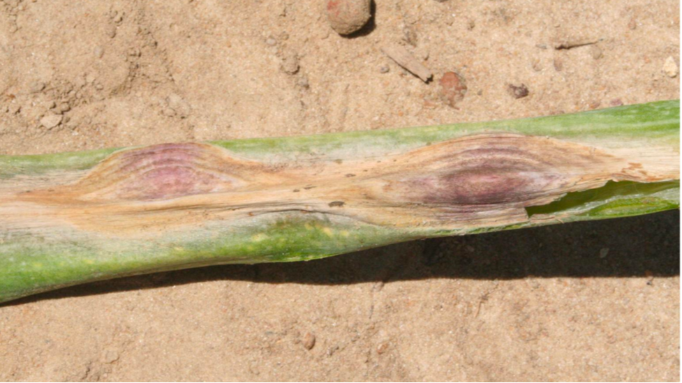 Older leaves tend to be more susceptible than younger leaves. Symptoms begin as water-soaked lesions that usually have a white center. Under humid weather conditions, the disease intensifies, producing brownish oval lesions with purple centers on the leaves, often forming concentric rings. These lesions are surrounded by yellow halos, and as they enlarge, they can encircle the entire leaf, causing it to wither and collapse. As foliage declines, photosynthesis is reduced, leading to lower bulb yields. In onion grown for green shoots, this disease reduces the number of marketable leeks.