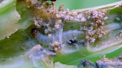 Eggs are laid on the leaves, oval in shape and creamy-white in color. Full-grown larvae are creamy-white with longitudinal pinkish-brown streaks along the body. The caterpillars roll the leaves and bore through the midrib, petiole, and stem tissues while feeding. Infested areas are covered with silken webbing intermingled with frass. Characteristic feeding damage appears as holes near the basal portions of the midrib on older leaves.