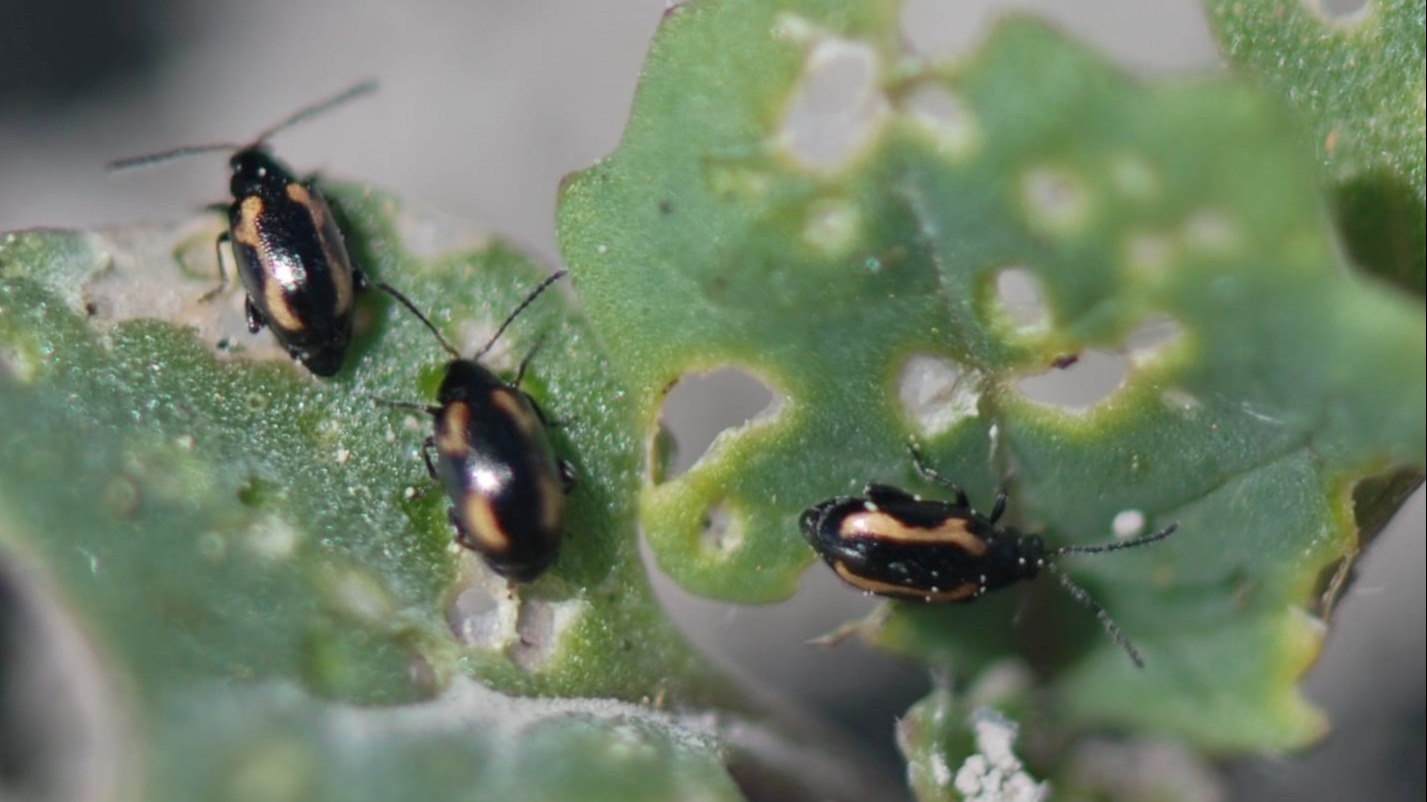 Both larvae and adults feed on leaves during the early morning and late afternoon when temperatures are cooler. The damaged leaves show characteristic round, uniform holes. The small grubs present in the soil feed on tender roots, causing further injury to the plants.